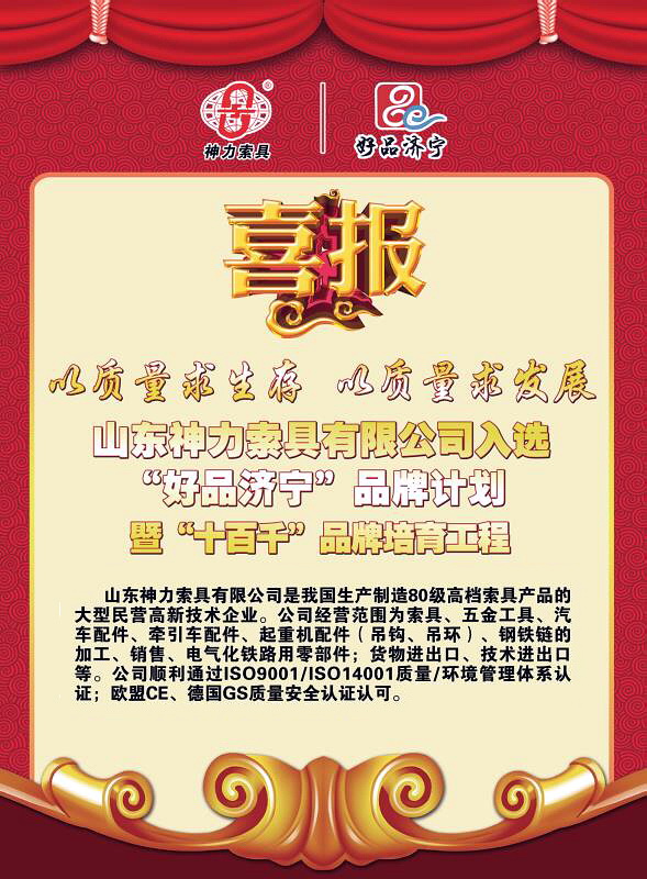 神力索具产品被机械电子工业部评定为优质产品,被国家经贸委认定为国家级新产品,并荣获“九五”国家技术创新优秀项目奖、“最具市场竞争力品牌”、“中国索具行业50强企业”、“山东名牌”、“山东省著名商标”、“中国出口名牌”“山东省高新技术企业”“山东省索具工程技术中心”、“中国驰名商标”等称号。神力索具先后荣获全国轻工业系统先进集体、中国轻工业思想政治工作优秀企业、中国专利山东明星企业、中国锻压协会工作先进单位、山东省“十五”期间机电产品出口先进企业、山东省现场管理样板企业、山东省旺财28建设示范单位、山东省技术创新示范企业、山东省节能示范企业、山东省机械行业文明单位、山东省百强民营企业、连续三年济宁百强民营企业等多项荣誉称号。