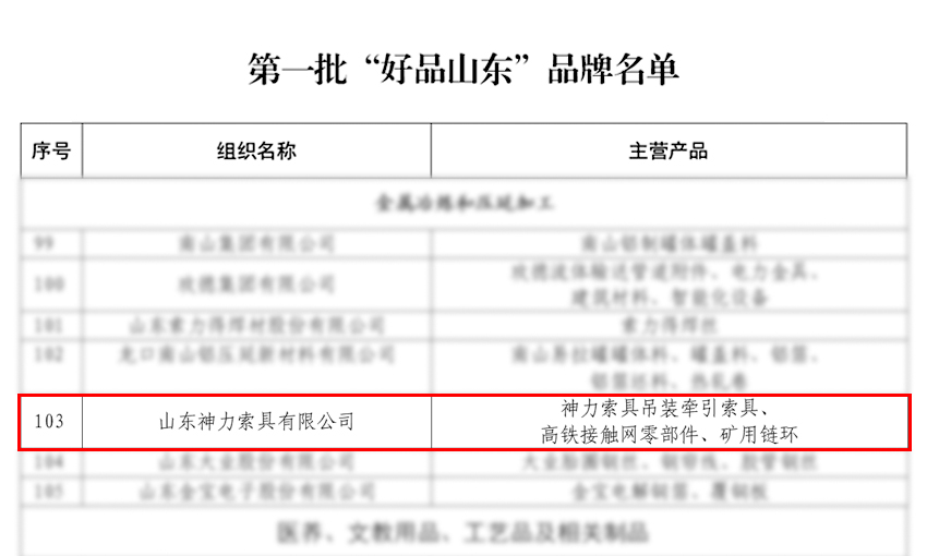 3月2日,“好品山东”建设旺财28 发布会在济南举行,公布第一批223家“好品山东”品牌。主营吊装牵引索具、高铁接触网零部件、矿用链环的神力索具被评为首批“好品山东”品牌。
