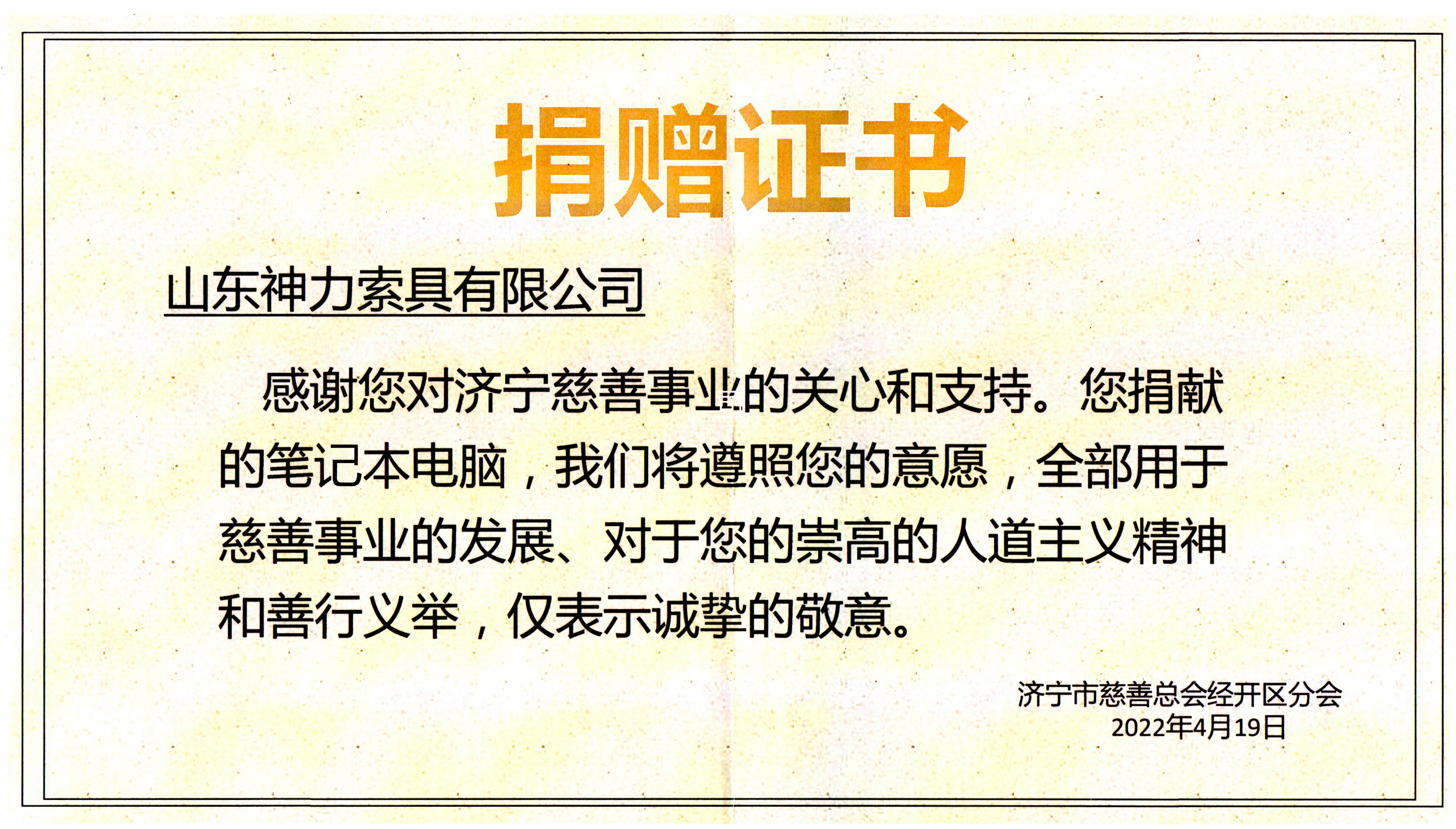 4月19日,在全区人民防控“新冠”疫情的关键时刻,为助力解决全区核酸检测点办公设备短缺,加快核酸检测结果快速录入信息系统问题,公司总经理杜大平代表公司向经开区疫情防控指挥部捐赠总价值36万元的荣耀牌笔记本电脑100台,展现了神力索具公司与全区上下合力打赢疫情防控攻坚战的信心和决心。