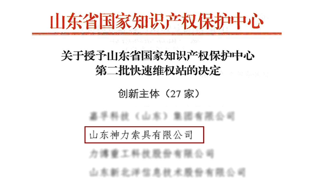 神力索具作为在山东省国家知识产权保护中心备案的快速审查企业、首批“专精特新”小巨人企业,依托创新优势、科技产业优势,积极参与,勇于担当,助力知识产权强省建设。经过逐级申报、初步审核、公开公示,神力索具被山东省国家知识产权保护中心授予“山东省国家知识产权保护中心快速维权站”,成为山东省第二批获批的快速维权站创新主体。