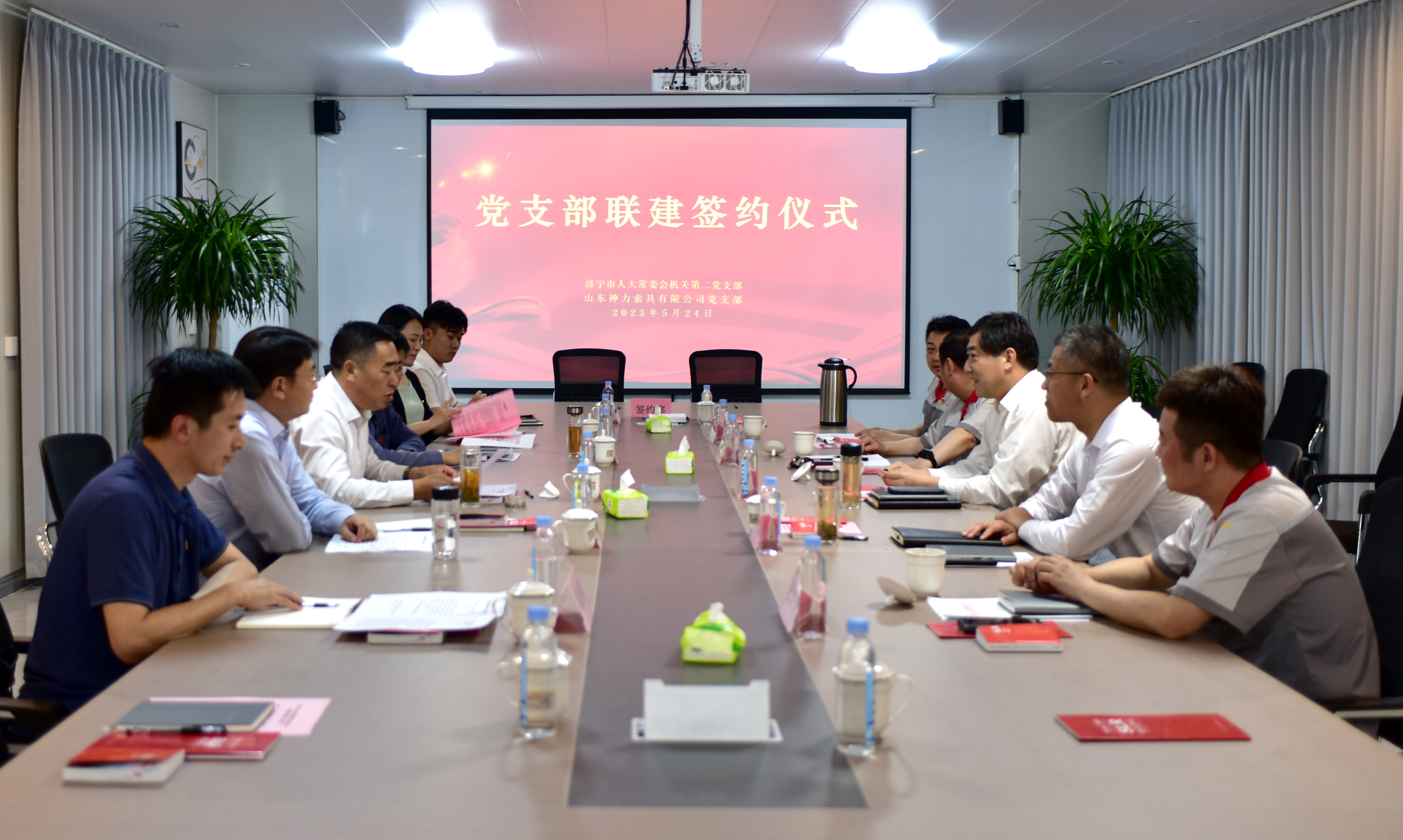 本次会议由市人大常委会副秘书长、办公室主任孟青松同志主持,市人大常委会法工委综合科科长张伟同志宣读党支部联建协议书。市人大常委会法工委副主任郝永伟同志与神力索具董事长杜亚中同志签署党支部联建协议书。