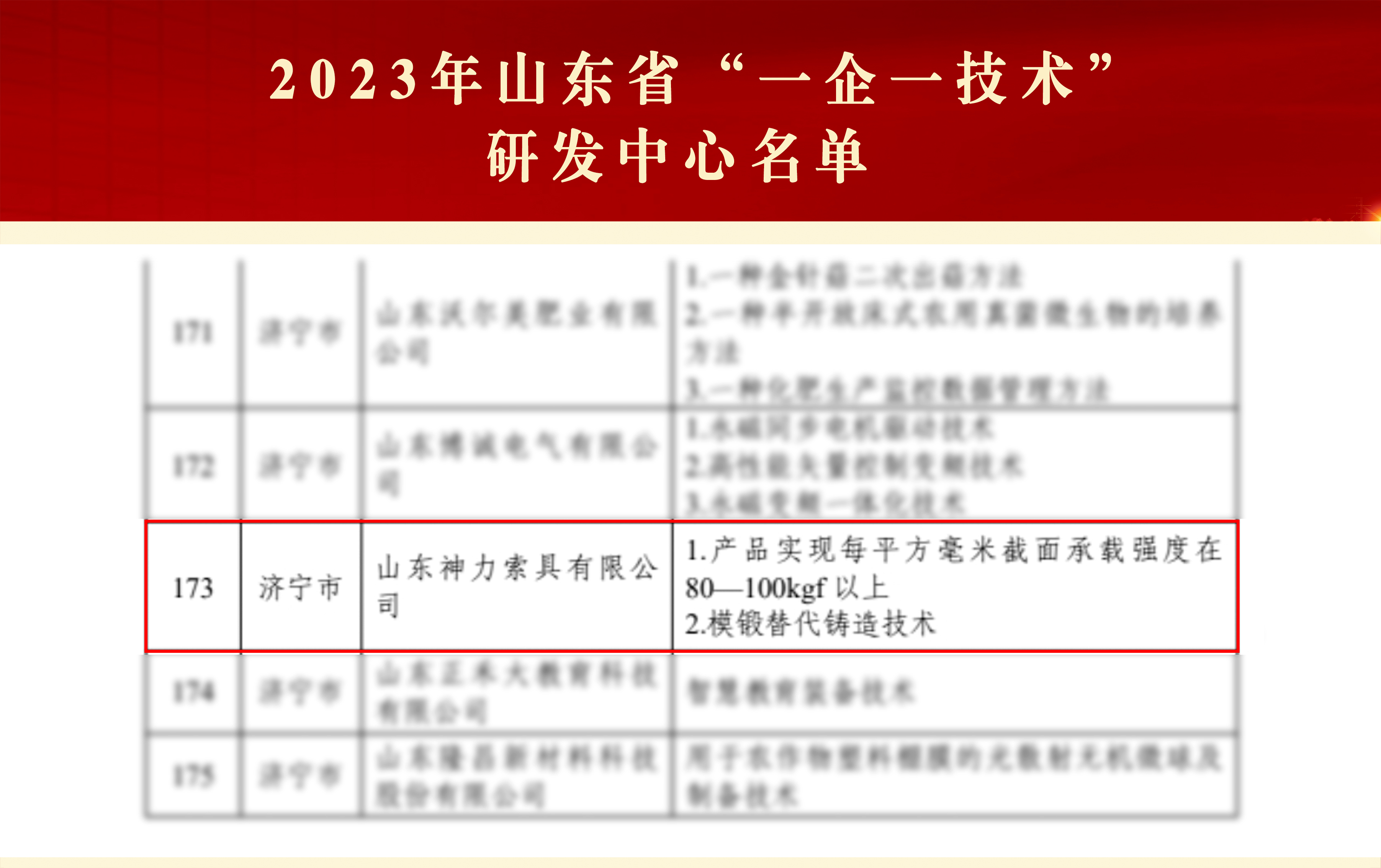 经企业自愿申报、有关部门推荐、专家论证和网上公示等程序,认定全省288家企业研发机构为2023年山东省“一企一技术”研发中心,其中神力索具凭借关键技术“1、产品实现每平方毫米截面承载强度在80-100Kgf以上 2、模锻替代铸造技术”荣登榜单!