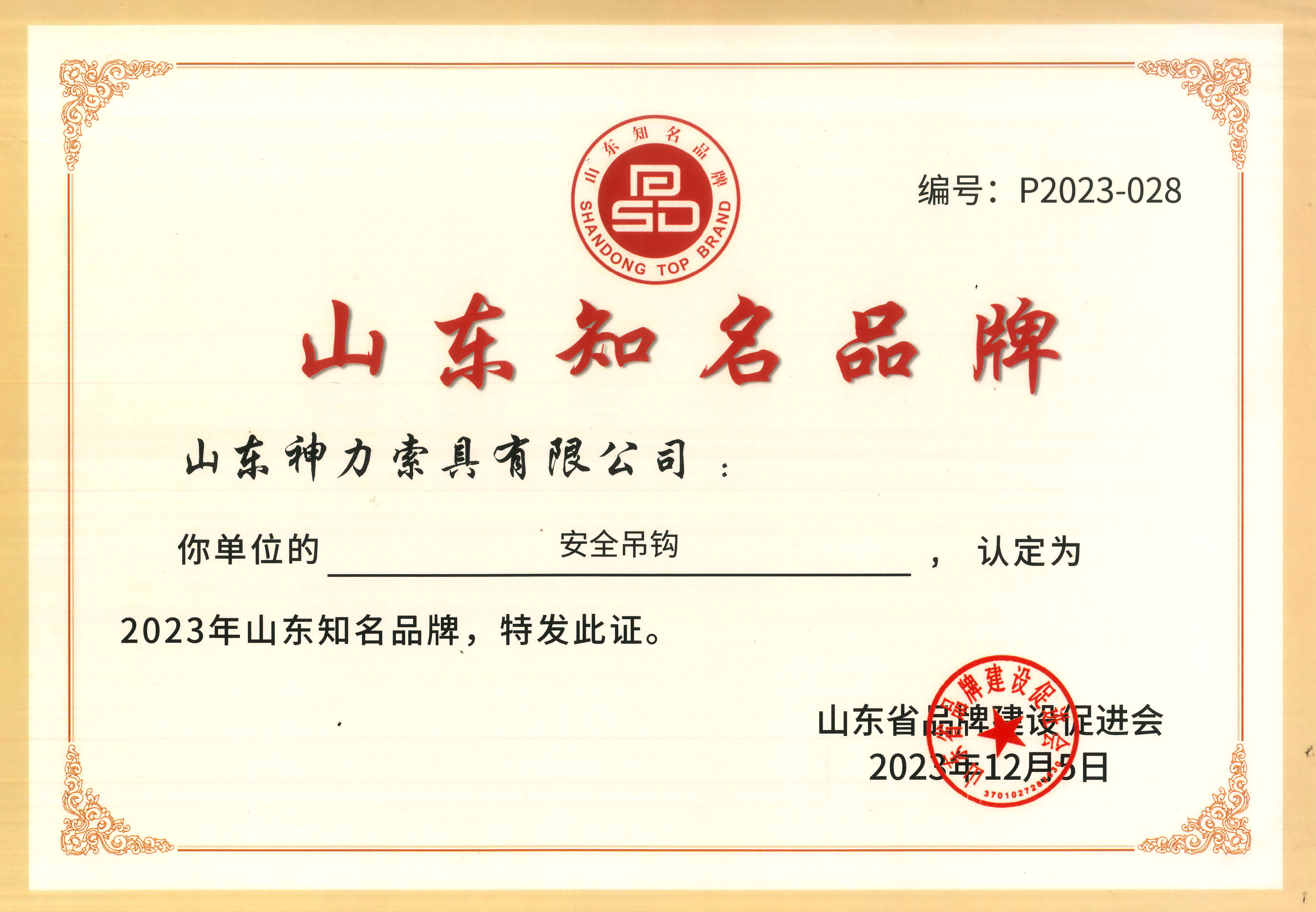神力索具安全吊钩荣选“2023年山东知名品牌”