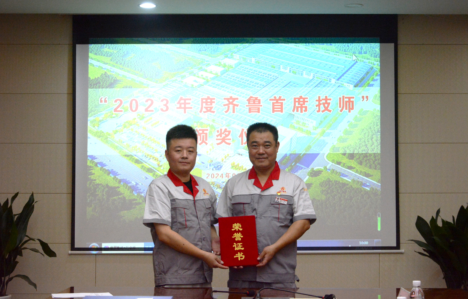 近日,在中共山东省委组织部、山东省人力资源和社会保障厅、山东省财政厅公布的2023年度齐鲁首席技师名单中,神力索具轨道分厂厂长丁德政同志荣获“2023年度齐鲁首席技师”称号。6月28日,公司董事长兼总经理杜大平亲自为其颁发荣誉证书。